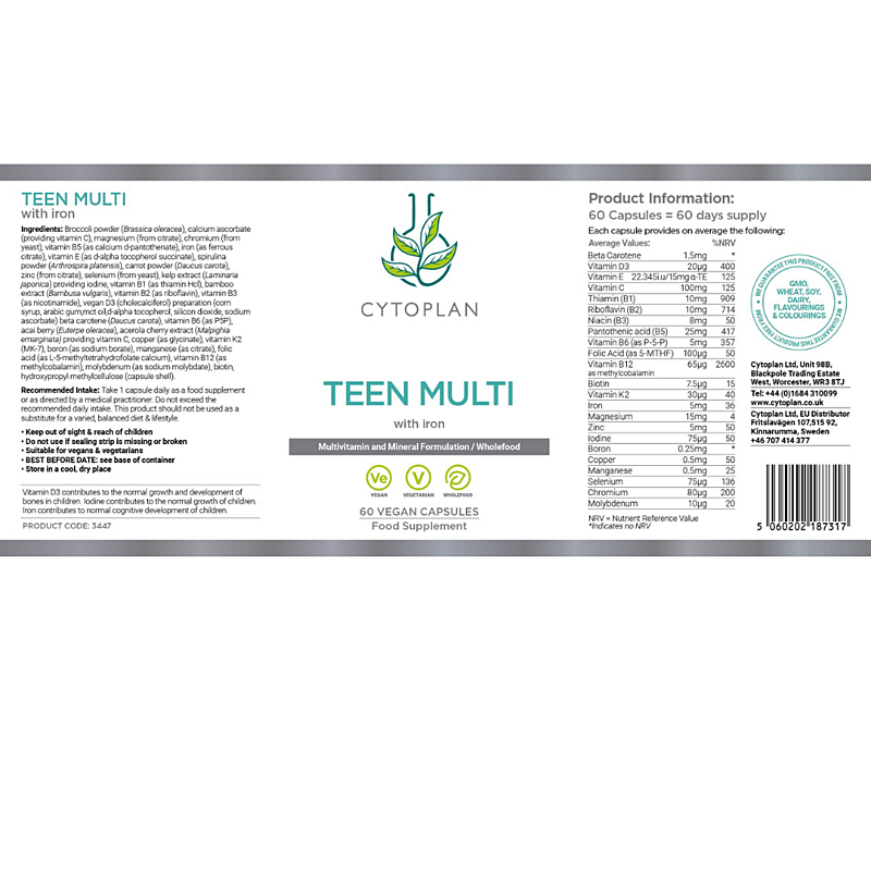Cytoplan Multivitamin pro teenagery je komplexní směsí vitaminů, minerálů a rostlinných složek vytvořenou pro potřeby dospívajících. Obsahuje bioaktivní formy živin včetně kyseliny listové, vitaminu B12 a vitaminu B6, stejně jako dobře vstřebatelné železo. Směs fytonutrientů z brokolice, mrkve, spiruliny, aceroly a acai poskytuje další mikroživiny pocházející z rostlinných zdrojů. Přípravek je vhodný pro aktivní a vytížené teenagery, kteří potřebují pravidelné doplnění vybraných vitaminů a minerálů. Jednoduchý způsob, jak začlenit kvalitní živiny do každodenního režimu dospívajícího.