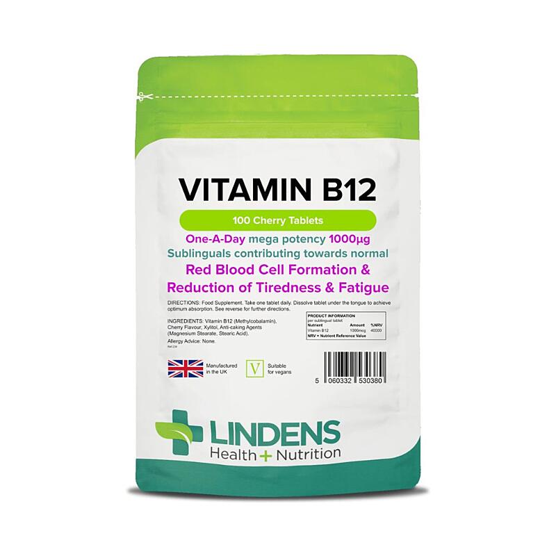 Tablety Lindens Vitamín B12 1000 µg Sublingual jsou mimořádně silné, poskytují až 40 000 % RHP vitamínu B12 na jednu tabletu! Tyto speciálně vyvinuté tablety jsou navrženy k rozpuštění pod jazykem pro maximální absorpci, přičemž vitamín B12 se rychle uvolňuje spolu s příjemnou třešňovou příchutí.