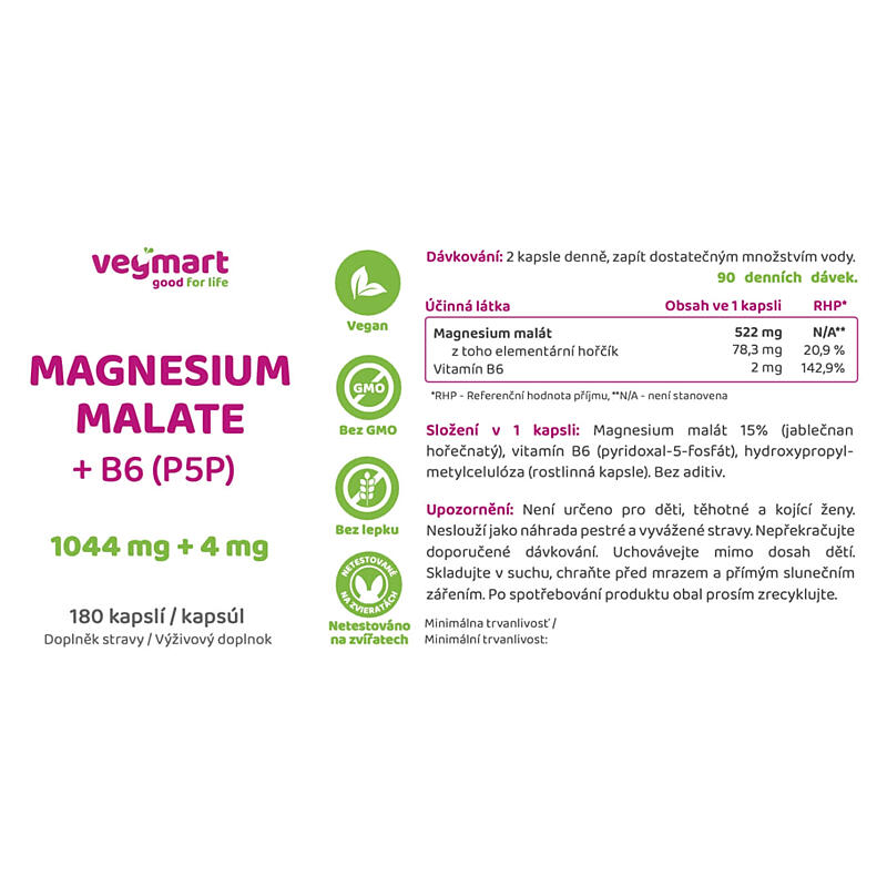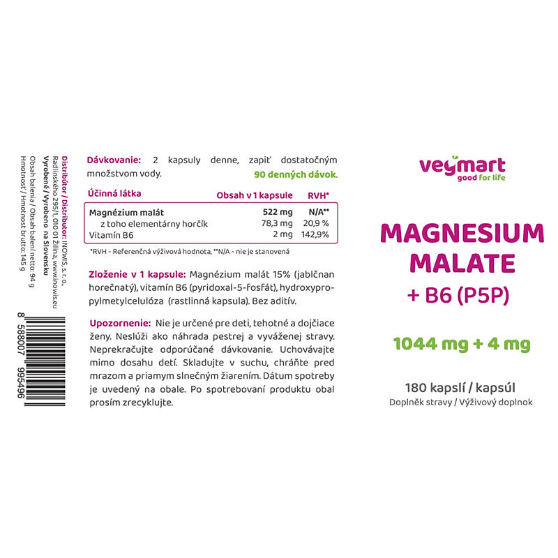Magnézium malát 15 % + Vitamín B6 (P5P) je výživový doplnok z portfólia našej značky Vegmart. Našou filozofiou je ponúkať Vám čisté, 100% vegánske doplnky výživy z kvalitných surovín a s vysokým obsahom účinných látok, bez zbytočných aditív. Vegmart – good for life.