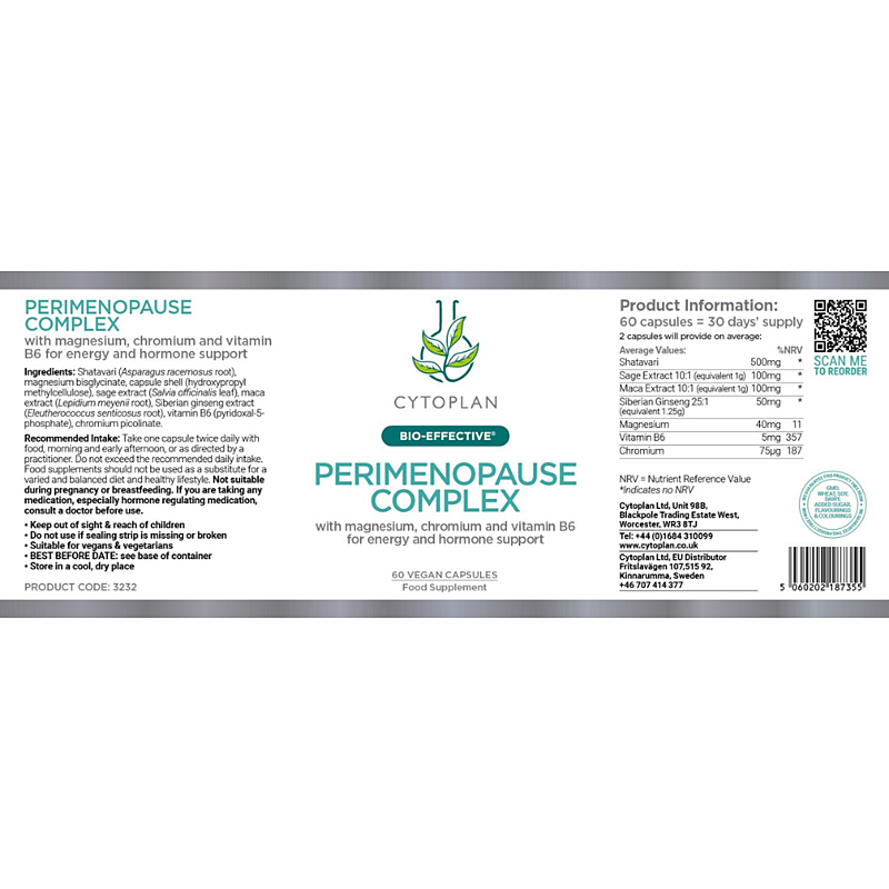 Cytoplan Komplex pre obdobie perimenopauzy obsahuje kombináciu rastlinných extraktov a živín vhodných pre ženy v prechodovom období. Komplex obsahuje bylinky pre ženy ako šatavari, maca, ženšen a šalviu. Horčík v dobre tolerovanej forme bisglycinátu a vitamín B6 dopĺňajú príjem vybraných mikroživín v strave. Chróm je súčasťou receptúry ako ďalší z minerálov využívaných v doplnkoch stravy. Tento komplex predstavuje spôsob, ako zaradiť rastlinné extrakty a dôležité živiny do každodenného režimu počas perimenopauzálneho obdobia.