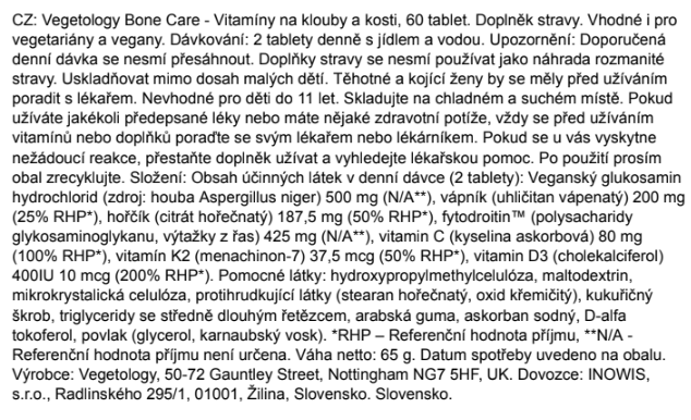 Výživový doplnok Vegetology Bone Care - Vitamíny na kĺby a kosti obsahuje unikátnu 100% vegánsku alternatívu chondroitínu - Fytodroitín™ - a tiež vegánsky glukozamín pochádzajúci z huby Aspergil čierny, ktoré sú doplnené dôležitými vitamínmi a minerálmi ako vitamín C, D3, K2, horčík a vápnik. Táto kombinácia poskytuje rovnaké vlastnosti potrebné na udržanie zdravých kostí a kĺbov bez vplyvu na životné prostredie v spojení s rybolovom než iné nevegánske alternatívy. Bez obsahu živočíšnych zložiek, bez lepku, bez cukru a bez GMO. Bone Care je nový názov pre Joint-Vie.