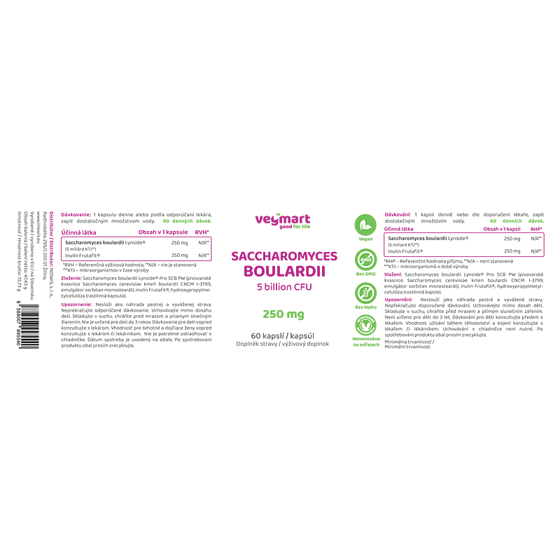 Ak hľadáte spoľahlivého partnera na cesty v podobe kvalitných vegánskych probiotík alebo prechádzate zmenami trávenia, vyskúšajte kapsuly Saccharomyces boulardii značky Lynside® od Vegmart. Každá kapsula obsahuje 250 mg Saccharomyces boulardii Lynside®Pro SCB PW (Pivovarské kvasnice Saccharomyces cerevisiae kmeň boulardii CNCM I-3799). Zloženie je obohatené o prebiotickú vlákninu Inulín Frutafit® pre optimálne trávenie.