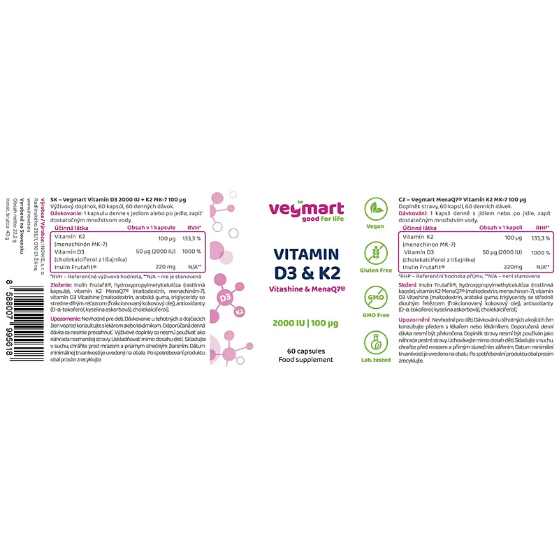 Dva dôležité vitamíny, jeden produkt! Vegmart vám prináša prémiovú kombináciu vitamínu D3 Vitashine a vitamínu K2 MenaQ7® (menachinón MK-7)! Vitamíny D3 a K2 sa navzájom dopĺňajú a fungujú synergicky. Kapsuly obsahujú až 50 µg (2000 IU) vitamínu D3 Vitashine a 100 µg vitamínu K2 MenaQ7® – stačí 1 kapsula denne. Patentované, klinicky overené formy, čisté zloženie, najvyššia kvalita. Vhodné aj pre vegánov a vegetariánov.
